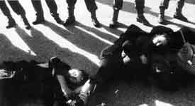 The police train the cannons on a small group, to break down their resistance, then move in to move and/or arrest them one-by-one. But there are 9,000 people in the way now, so arrests become impossible. Susan Lee, camera in hand, gets picked up by her hair and thrown across the road. Krista, an activist now working in the Czech Republic against the Temelin reactors, gets clubbed. Others get off easier. Still, tension is building.