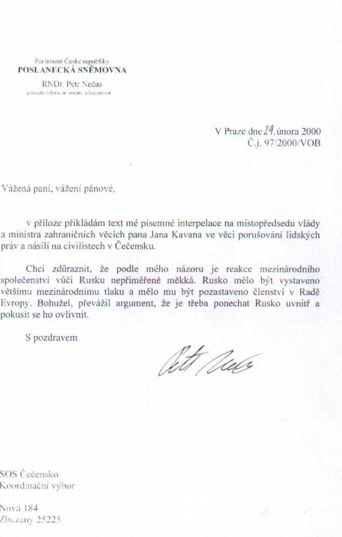 Čečensko VIDEOPROJEKCE FILMŮ každý den od 18.00 - Čajovna Duše , Dlohá 33, Praha 1  - ZVEME VŠECHNY NA TISKOVOU KONFERENCI "ČESKÁ REPUBLIKA A ČEČENSKO" ,ve čtvrtek 30. brezna 2000 v 11:00 v budove YMCA, Na Porici 12, Praha 1, v zasedaci mistnosti v prizemi, přítomni budou: Zuzana Roithová, Jiří Payne, Lubomír Zaorálek, Jana Hradílková, Tomáš Pojar a další
